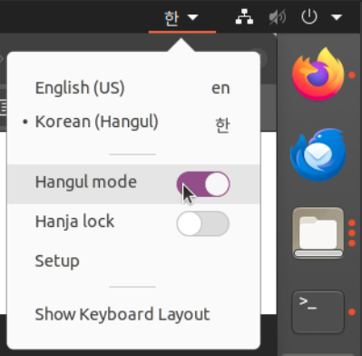 Hangul mode from the language setting from the top bar.